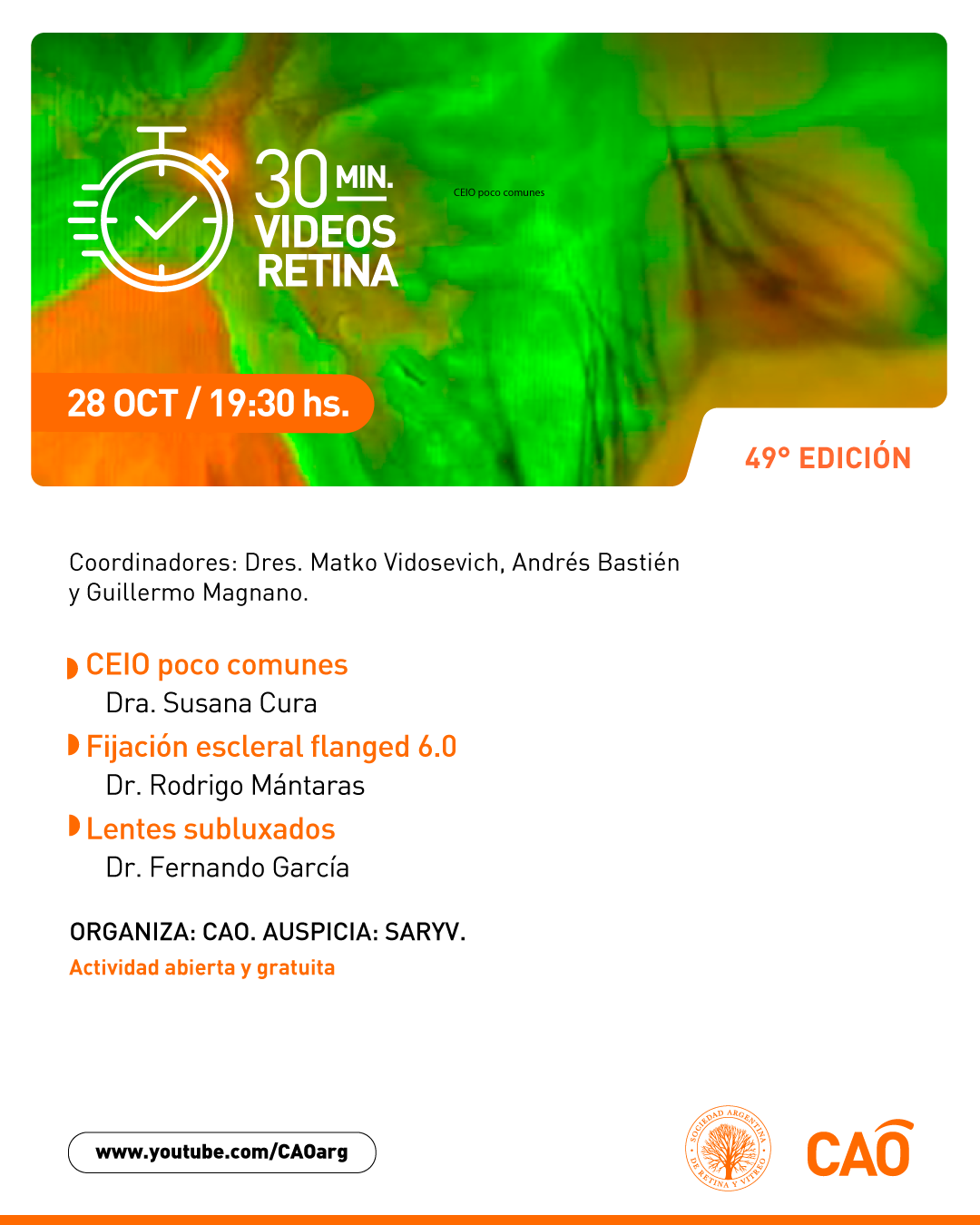 "30 Minutos de Videos de Retina" es un ciclo de charlas abiertas y gratuitas que se desarrolla el último martes de 19:30 a 20 hs., bajo la dirección de los Dres. Matko Vidosevich, Andrés Bastien y Guillermo Magnano y en colaboración con la Sociedad Argentina de Retina y Vítreo (SARyV). Durante cada encuentro se presentan videos de resolución de casos-problema relacionados con la retina, en forma dinámica y rápida, y orientados tanto al cirujano general como al cirujano experto. La transmisión se realiza vía canal de YouTube del CAO.