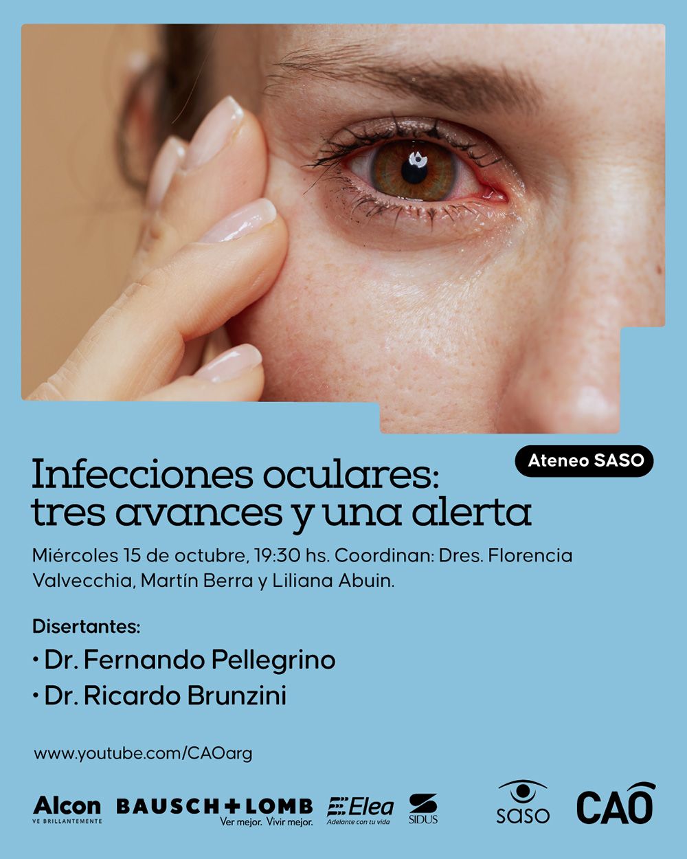 El próximo miércoles 15 de septiembre, a las 19:30 hs. de Argentina, comienza el Ateneo SASO: "Infecciones oculares: tres avances y una alerta", coordinado por los Dres. Florencia Valvecchia, Alejandro Berra y Liliana Abuin. La charla se transmitirá en vivo por el canal de YouTube del CAO.