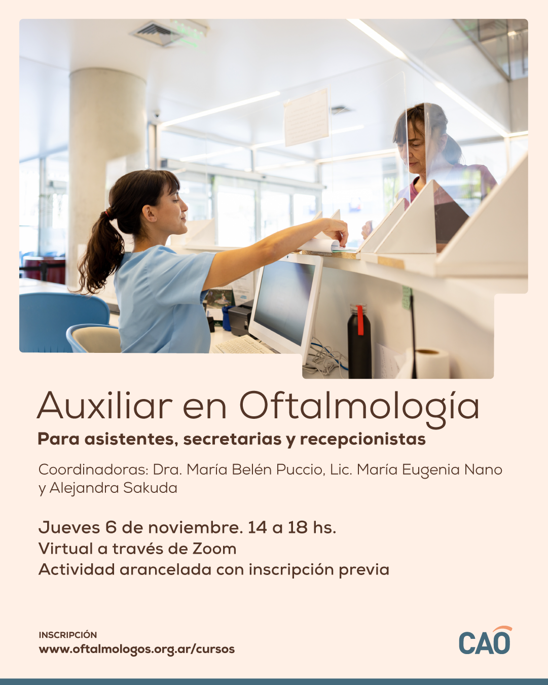 Lo invitamos a participar del Curso Auxiliar en Oftalmología CAO 2025, una propuesta de formación pensada para quienes desempeñan un rol esencial en la atención oftalmológica. El encuentro se realizará el jueves 6 de noviembre a las 14.00 h, a través de la plataforma Zoom. El curso ofrece las herramientas necesarias para fortalecer la labor diaria en consultorios, clínicas y servicios de oftalmología, promoviendo una atención más eficiente, humana y profesional desde el primer contacto con el paciente.
