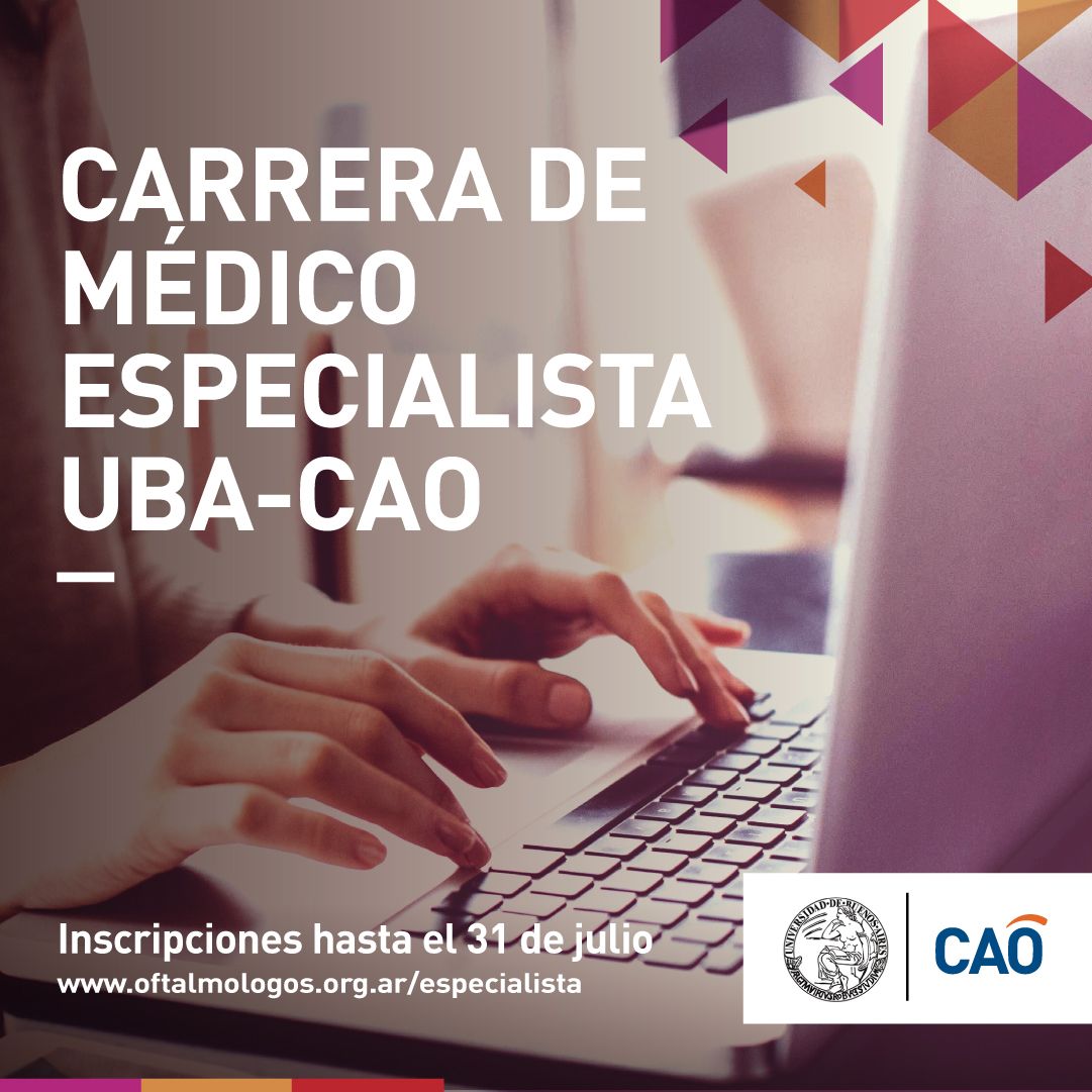 La Carrera de Médico Especialista UBA-CAO tiene una duración de 3 años. El proceso de inscripción incluye una preselección con entrevista personal. La cursada se realiza dos veces por semana (4 horas semanales) en formato online. Las inscripciones para el ciclo lectivo actual comienzan el 5 de mayo y finalizan el 31 de julio de 2026 (del 1 al 21 de septiembre, sólo Ingreso Automático).