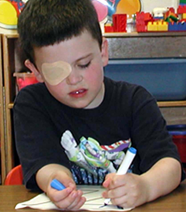Foto 4: Un niño con un parche para estimular la visión del ojo perezoso.