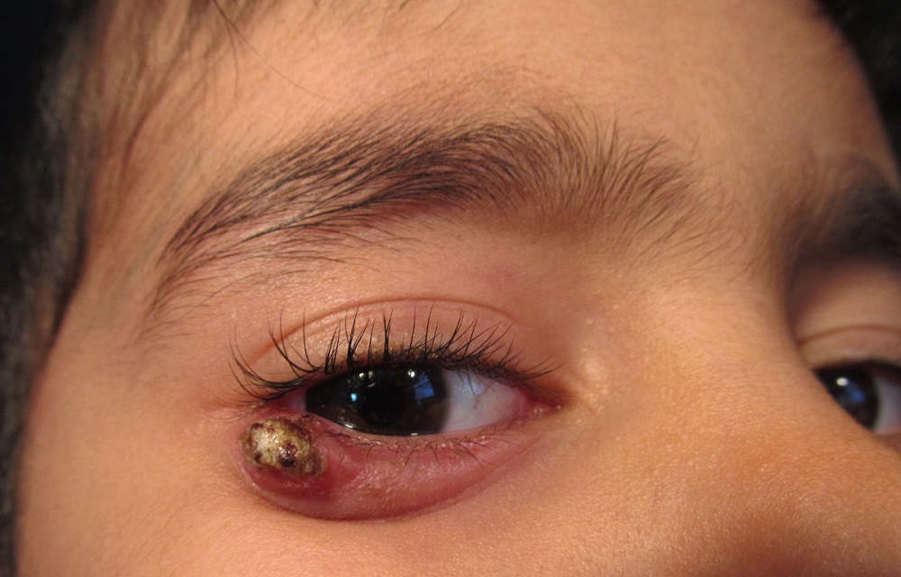 - Lesión roja en borde del párpado, en algunos casos pueden aparecer en la parte interna. Luego de unos días ‘al madurar’ aparece un puntito blanco al lado de las pestañas.